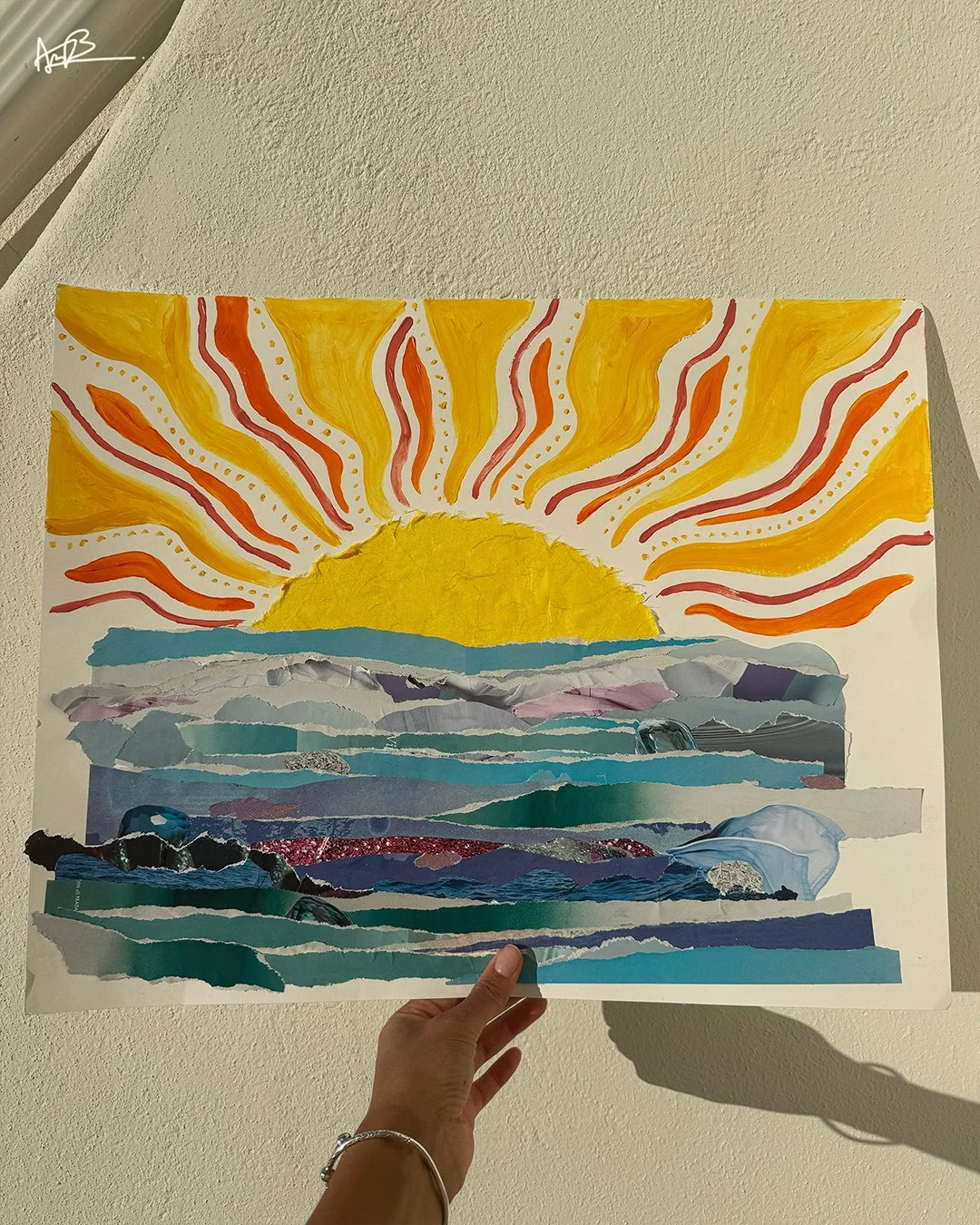 A handmade collage capturing the deep and varied layers of waves and rays. A dance between cool and warmth, water and fire.